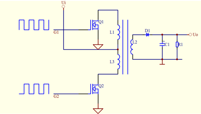 該種開關(guān)電源成本較低,可以輸出多組不同的電壓,電壓調(diào)整方便,因而使用非常廣泛。首要缺點是:紋波電壓較大(一個周期僅作業(yè)半個周期左右)。另一點便是,當(dāng)Q截止時,Q1承受很大的反向電壓。U=2Ui,所以Q1挑選耐壓較大的。