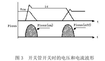 圖3是開關管開關時的電壓和電流波形。開關管不是理想器件,因此在開關管開關工作時,要產生開通損耗和關斷損耗,統稱為開關損耗(SwitchingLoss)。開關頻率越高,總的開關損耗越大,變換器的效率就越低。開關電源損耗的存在限制了變換器開關頻率的提高,從而限制了變換器的小型化和輕量化。