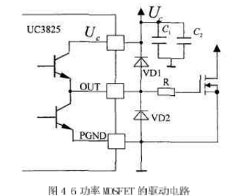 功率MOSFET驅動電路如圖4-6所示。UC3825推拉式輸出電路的每個輸出端都可輸出峰值為2A的電流。該輸出電流在20ns內可使1000pF電容兩端的電壓上升15V。采用獨立的集電極電源Uc和功率地線PGND腳,能夠減小大功率門極驅動噪聲對集成電路內模擬電路的干擾。每個輸出端(OUT)UcPGND之間,都應加入一只3A的肖特基二極管(IN5120USID245或相同性能的器件),如圖4-6所示。該二極管可將輸出電壓的幅值鉗位在電源電壓,這對任何電感性和電容性負載都是必要的。