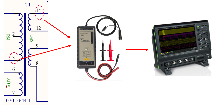 回到本文的重點,接下來測試一次側高壓端與SELV電路之間的重復峰值電壓是否超過750V閾值電壓。有經驗的同學都知道,在開關電源中,重點是要找到變換器中的動點,也就是電壓的變化率dv/dt最大的節點,在圖5中,一次側高壓端的監測點就可以選為Q1Drain極,也就是變壓器T1pin 3,安全二次側SELV的監測點既可以選擇變壓器T1pin 12,也可以選擇變壓器T1pin 14,最后以正常帶載工況下一次側、二次側之間檢測到最大電壓為作為設定局部放電電壓UPD的基準。