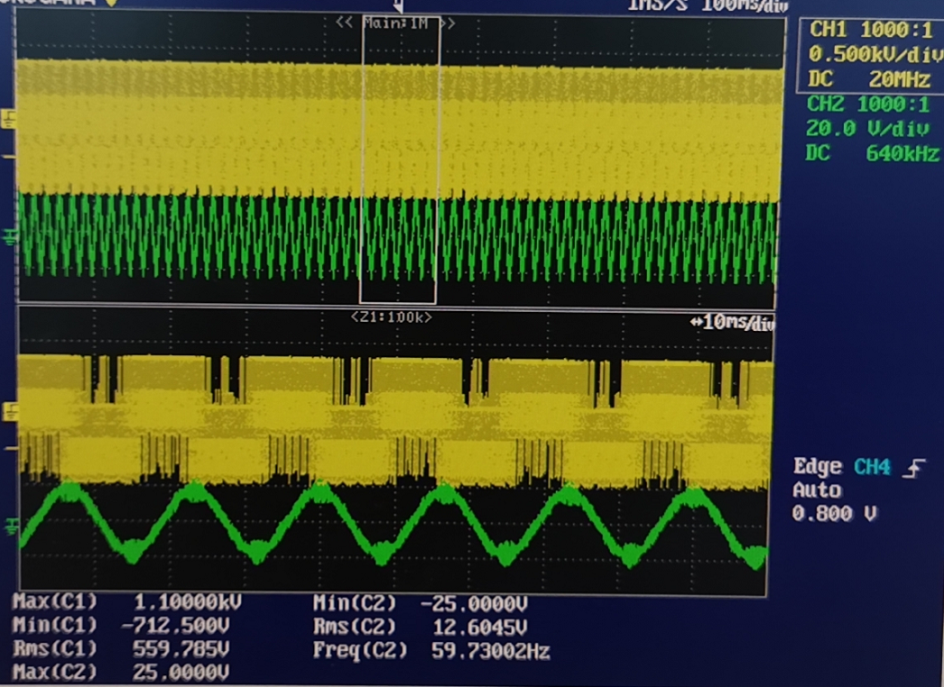 以三相480V變頻器為例,交流輸入線電壓為480Vrms,則其母線電壓平均值為480*1.35=648Vdc,也就是進入輔助開關電源SPS的工作電壓就是648V,這個電壓值已經非常接近750V這個閾值,同時,需要注意的是,750V閾值電壓是在整機實際運行過程中,實際測試得到的一次側高壓端與SELV電路之間的重復峰值電壓,用高壓差分探頭分別勾取兩邊的監測點,若此電壓超過750V,同時,在絕緣層厚度方向上的電壓應力超過了1KV/mm,則局部放電測試認證必做。
