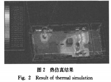 根據主要發熱元器件的損耗計算公式,得到各損耗值,將其導入仿真軟件;利用Ansoft仿真軟件的內部求解器獲得實際電路的3D發熱模型,如圖2所示。從圖中可以清晰地看到電路內部及各個元器件上的熱量分布情況。根據仿真結果(圖2)可知,功率MOSFET上的熱量和變壓器的熱量最高(紅色部分),這與從電路理論上分析求得的這兩種器件的功耗(見表2)相吻合。