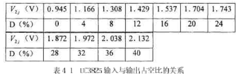 經(jīng)過試驗可知,UC3825的2腳輸入和outA.、outB輸出的PWM脈沖信號的占空比是滿意線性聯(lián)系的。具休試驗數(shù)據(jù)如表4-1所示。咱們界說UC3825的2腳輸入為v2,輸出的PM信號占空比為D。從表41中的數(shù)據(jù)能夠看出,端口2的數(shù)值范鬧為:0.945V~-2.132v,而PWM脈沖信號的占空比在0%~-40%之間改變,與上述的結(jié)論是吻合的。