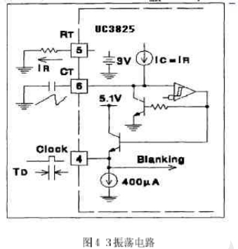 振動電路如圖4-3所示。UC3823A、B和UC3825A、B內(nèi)部都有一個鋸齒波振動器。鋸齒波上升沿的斜率由RT、Cr決議,確認RT、CT的辦法是:首要依據(jù)要求的最大占空比Dmax、挑選RT,再依據(jù)要求的頻率以及RT和Dmax挑選CT計算公式為: