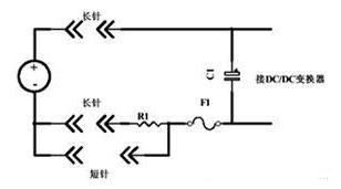 長(zhǎng)短針?lè)_擊電流管制電路如上圖所示:在DC-DC電源板刺進(jìn)時(shí),長(zhǎng)針觸摸,輸入電容C1通過(guò)電阻R1充電,當(dāng)電源板完全刺進(jìn)時(shí),電阻R1被斷針短路。C1代表DC-DC電源的一切電容量。